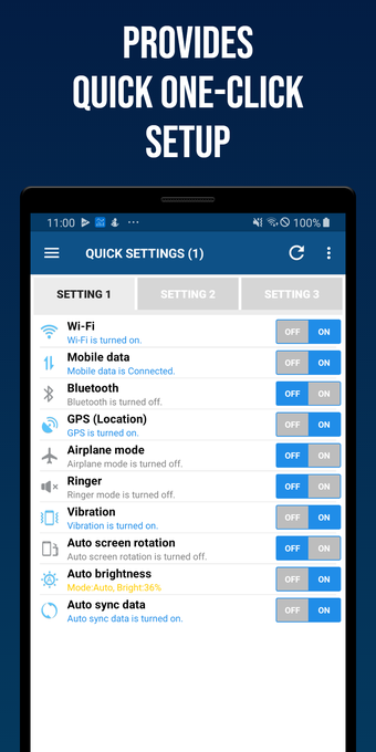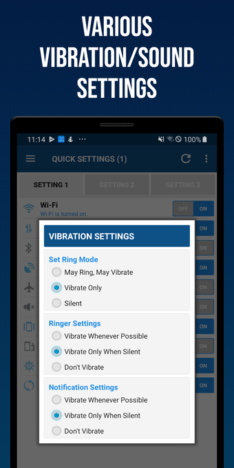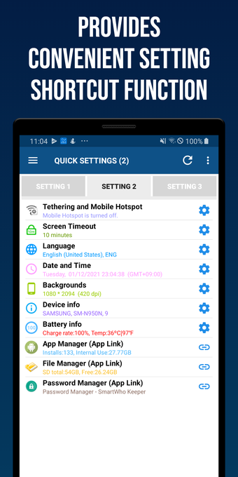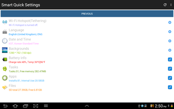 Smart Quick Settings , Android cihazınızda hızlı ve kolay bir şekilde yapılandırma değişiklikleri yapmanızı sağlayan ücretsiz bir uygulamadır. Wi-Fi, Bluetooth, veri, zil sesleri, titreşim, ekran döndürme ve dil gibi bir dizi sistem ayarının değiştirilmesini destekler. Ayrıca ana ekranın ve kilit ekranının arka plan görüntüsünü değiştirebilir.